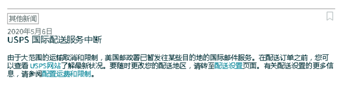 2020年5月6日,有卖家收到关于USPS国际配送服务中断的消息,由于大范围的运输取消和限制,美国邮政署已暂停发往某些目的地的国际邮件服务。
