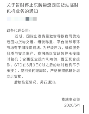 2020年5月1日,东航物流货站也发布通知表示,由于近期国际出港货量激增导致货站各环节均出现拥堵,故西区货站暂停承接临时包机。