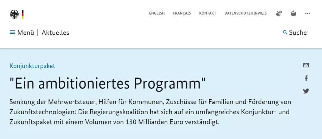 2020年6月3日晚间,德国联邦总理安格拉·多罗特娅·默克尔(Angela Dorothea Merkel)发布了最新的德国经济刺激计划。据了解,该项计划主要以减少增值税,向市政当局提供帮助,向家庭提供补助金以及推广未来技术为主。