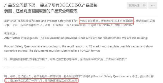 据这位苦B的卖家陈述,因为产品合规问题致导产品页面被移除了。他意识到这件事后,马上提交了CE证书,DOC以及ISO认证,产品图包装图后申诉后,虽然通过了审核,但是被审核的商品,仍要移除库存,有的商品还需要提供“产品安全调查表”。