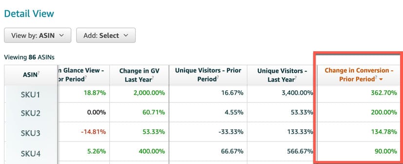 对于卖家而言,使用Amazon的Retail Analytics(ARA)跟踪性能可能会有些晦涩,但是关键指标是“转换前期的变化”,它允许您监视每个ASIN的转换率。