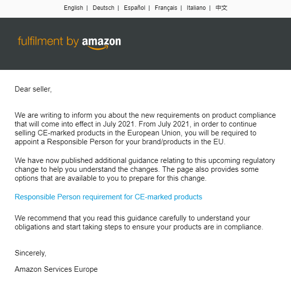 该新法规明确要求了欧盟境内CE标识商品的要求,目前有不少欧洲站的卖家都收到了亚马逊的通知,主要内容为: