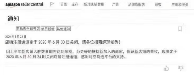这份所谓的“通知”称:“因上半年新店铺入驻数量即将达到预期,为更好的扶持新加入的商家,保证新店铺的营收,先决定于2020年6月30日24时关闭店铺注册通道,感谢对亚马逊平台的支持。”而最后,却确认这份通知是谣言!!