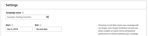 通过圣诞节和情人节促销等特殊促销活动,我们建议您设置开始日期和结束日期。如果您希望延长赞助商品牌广告系列的运行时间,可以将其设置为“无结束日期”。因此,您的广告将持续投放。