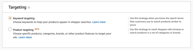 如果您的目标是定位客户在搜索栏中键入的搜索词以找到您的产品,请选择关键字定位。但是,如果要定位使用与您相似的产品和类别的用户,则可以使用产品定位。我们建议您使用关键字定位。