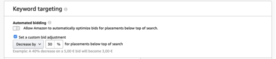 自定义出价调整:使用“自定义出价调整”,您可以为搜索顶部下方的展示位置指定出价的“减少”或“增加”百分比。例如:假设您出价10欧元。如果您选择“减少幅度”并决定20%,则出价为8欧元。