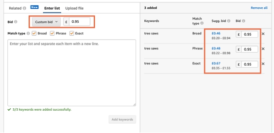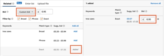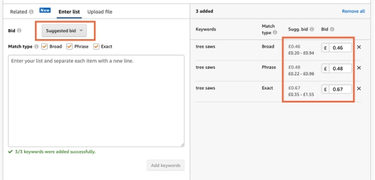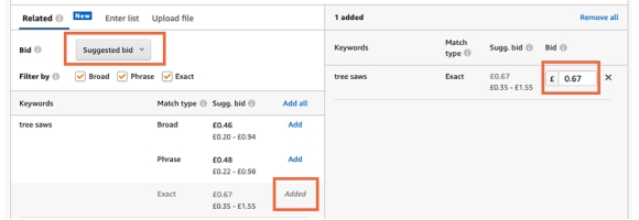 亚马逊会根据产品组合中的产品向我们显示“相关”关键字。我们可以添加关键字,调整每个关键字的出价并确定匹配类型。