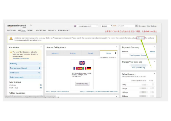 步骤如下:1、首先进入亚马逊后台,从提示需要KYC的界面,点击” click here“,如下图: