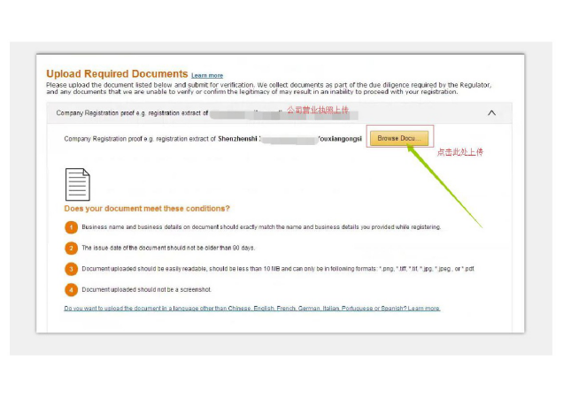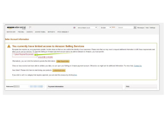 2、界面跳转到”You currently have limited access to Amazon Selling Services“点击”. “Upload Required Documents”上传资料(如下图)。
