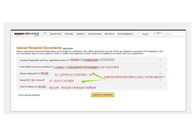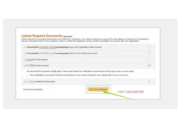 上传完”法人户口本“、正反面合在一起的身份证,在最后一步,点击界面“Submit for Verificatio”按钮提交审核即可。