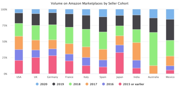 根据数据分析,亚马逊美国站6月份销量:有5.5%来自于2020年加入的卖家,2019年加入的卖家占16%,2018年注册的卖家占比19%,2017年注册的卖家占20%,2016年注册的卖家占16%,2015年或更早时候加入的卖家占20%。