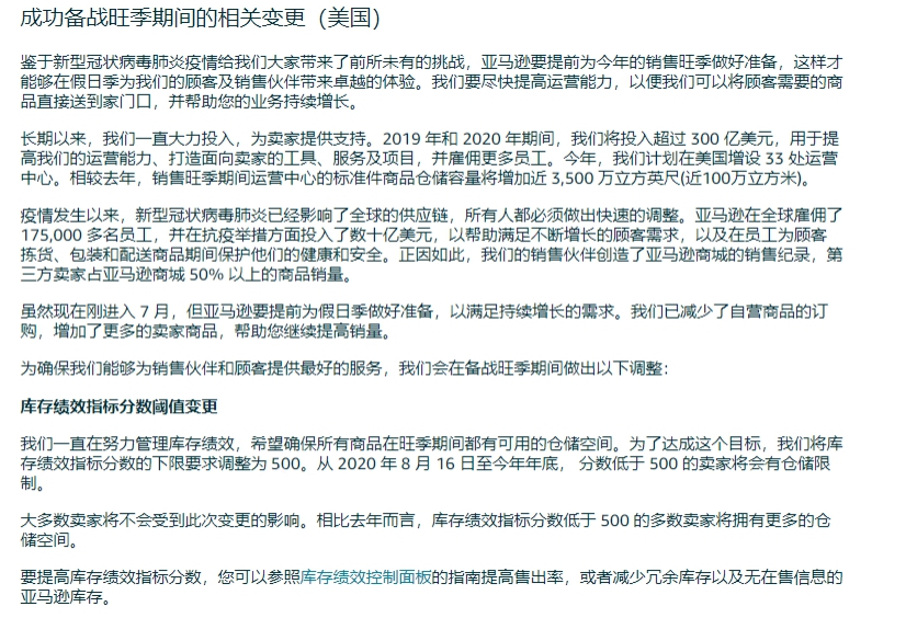 7月14日,亚马逊发出通知表示,亚马逊美国站为下半年的销售旺季做准备,为了能够保证在旺季到来的时候,所有的产品都能够拥有仓储空间,所以亚马逊美国站将亚马逊IPI的达标值进行了再次的上调,调整到500,而如果卖家们亚马逊IPI低于500,那么是会遇到从8月16日开始到年底,仓储被限制的情况的。