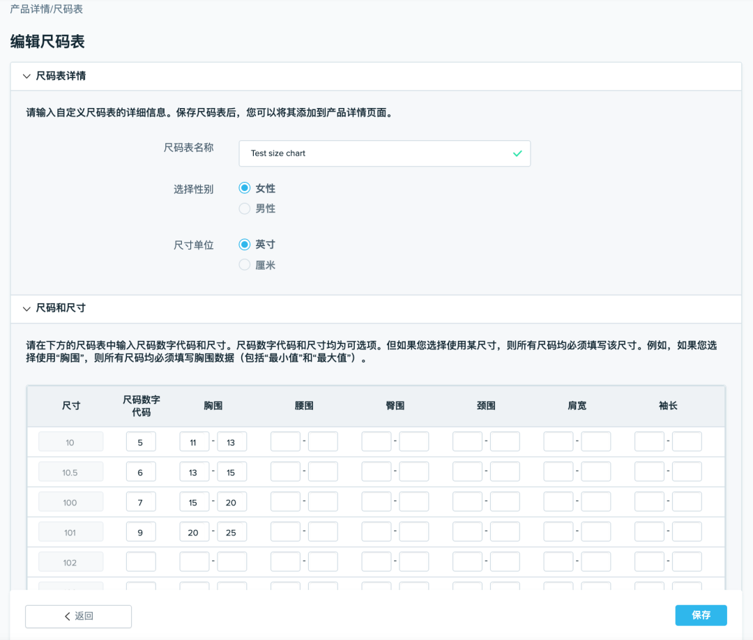 在创建尺码表的过程中需要注意,尺码表必须包含相应产品的所有尺码变体才能被添加到该产品中,如果卖家为某一产品添加了尺码变体,而产品对应的尺码表中不包含这个尺码,尺码表将会自动与该产品分离。