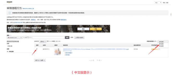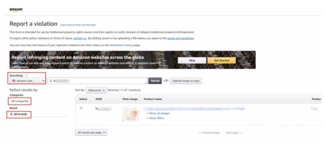 2. 进入投诉页面后,在框中输入需要投诉的产品名、商标名、ASIN、链接均可搜索出可能侵权的 Listing。此外,在搜索下方还提供上传图片进行搜索匹配找出可能侵权的 Listing。