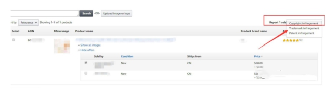 3.若输入 ASIN 号, 那么便会搜索出精准的 Listing,若您想要投诉的仅仅是 Listing下的某个跟卖者,只需要点击 Show Offers,查看此条Listing下所有卖家的详情。若此卖家确实侵权,就在勾选前方的小框框,便可进行投诉此 Listing。