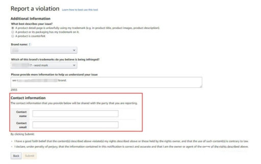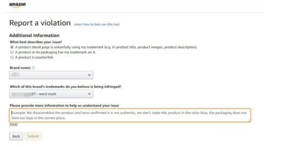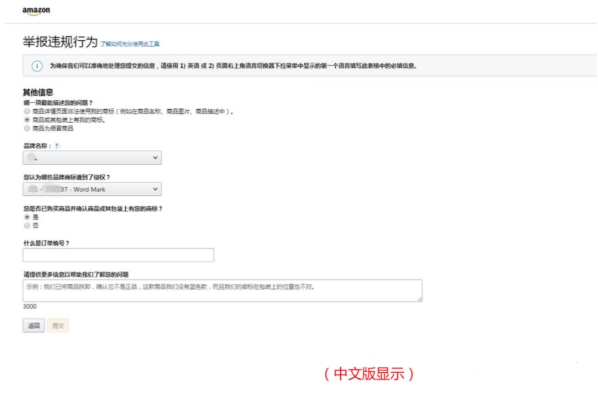选择了 1 选项后,弹出下方详细信息, 商标名部分系统会自动选择你已做了品牌备案的商标名,若你备案了多个品牌,则你需要选择对方侵权的那个商标。
