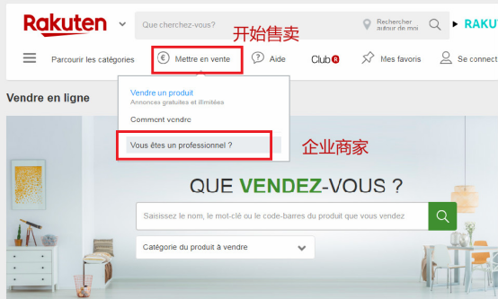 第一步:首先打开法国站乐天Rakuten的网址,点击首页搜索框下方的“mettre en vente”,“开始售卖”之后选择第三项“Vous êtes un professionnel ?”“您是企业商家?”