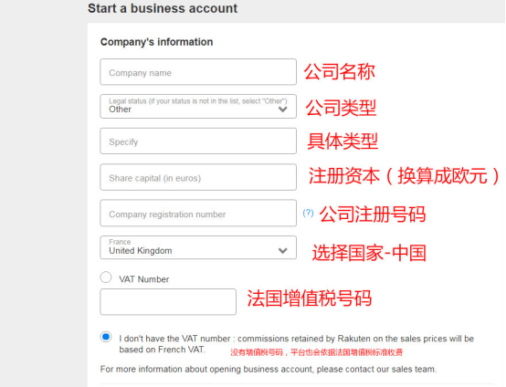 第二步:然后填写公司信息:公司名称、选择公司类型(如个人企业还是股份有限公司等),换算成欧元、中国公司填营业执照号码、所在国家选择中国,填写VAT增值税号码,即便中国卖家没有法国增值税号码,法国站乐天Rakuten也会按照法国增值税标准收费。