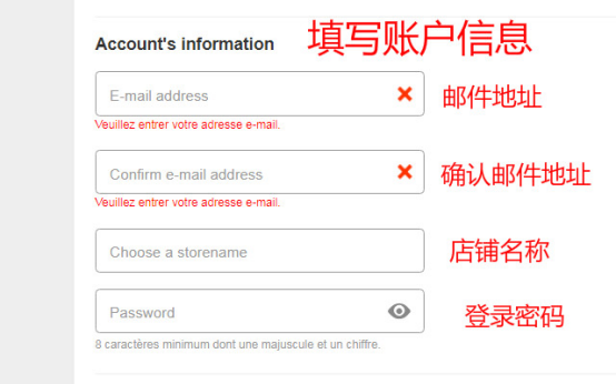 输入邮件地址—再次确认邮件地址—选择店铺名称—设置登录密码