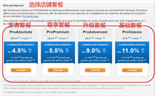 卖家可以针对自身的需求和预计销售情况,选择不同的开店套餐。套餐一共有四种,Absolute, Premium, Advanced ou Classic收费分别为39欧、99欧、299欧、499欧,套餐的详细介绍,请查看下面的法国站乐天Rakuten费用部分。