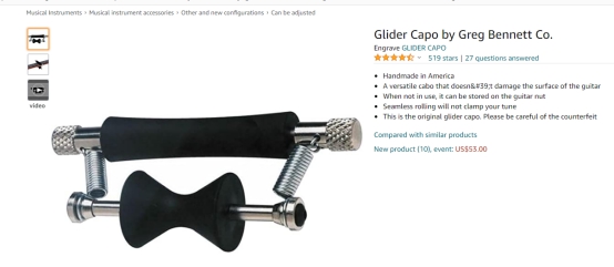至止目前为止,在亚马逊美国站,GLIDER CAPO吉它变调夹乐器排名第5450名,评分4.4分。