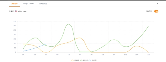 2021年的销售量高达61152,2020年5月份是相关产品销售的高峰期,搜索量高达156568。