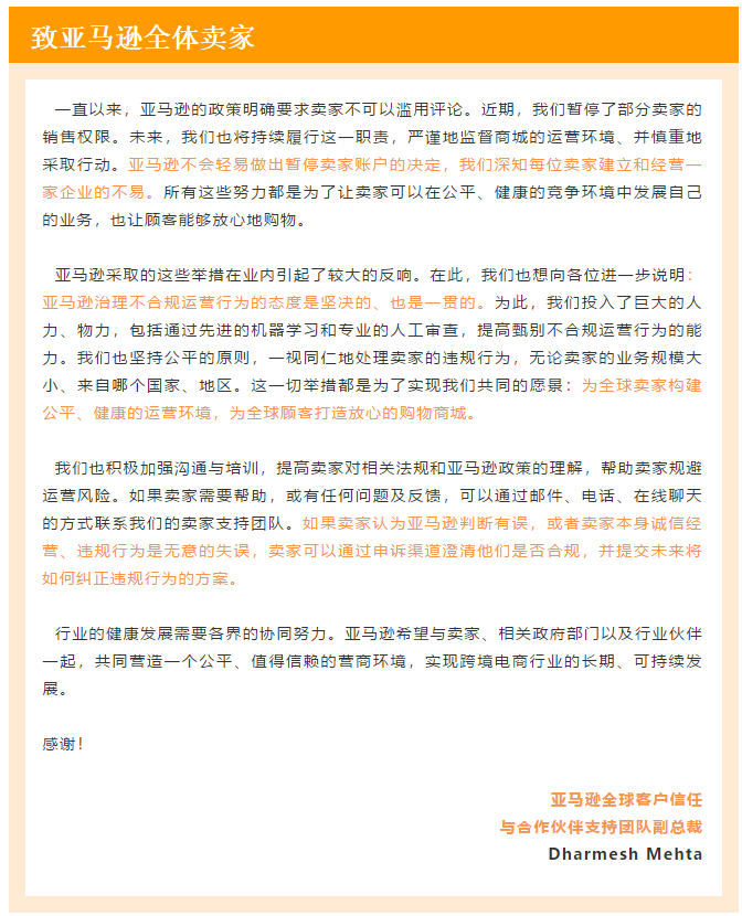前段时间多家头部卖家就因为违规刷好评引发了封号关店危机震惊了整个跨境电商圈,近日,亚马逊全球开店又发布了至卖家的一封信,表达了对于刷评此类违规行为的坚决打击态度。致亚马逊全体卖家的信内容如下: