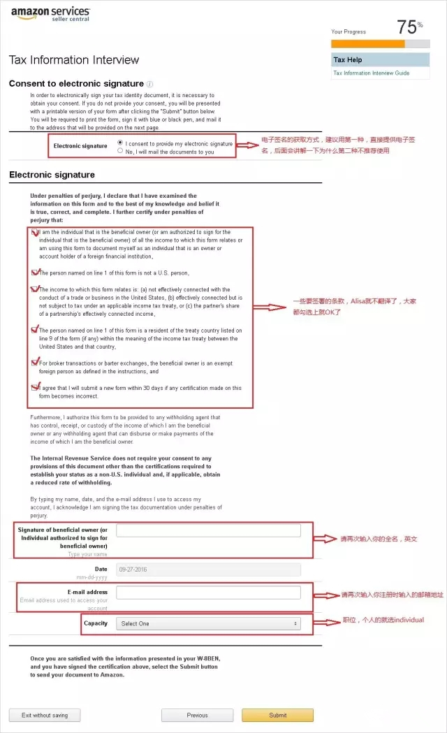 为了省事,这个地方建议大家选择同意提供电子签名而不是通过mail发送表格,简单有效。选择电子签名后,会弹出多选项和输入框。把这些勾选项都选上,然后写下公司名或者您的名字,邮箱地址以及国家,点击确定即可。
