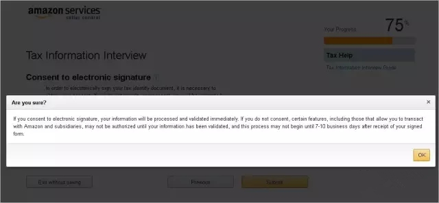 如果上一步你选择是第二种方式,系统会出现下图这个一个提醒,告知你如果你同意提供电子签名,那你的信息会立刻生效,如果你不同意提供电子签名,那么只有在收到你邮寄的表格后7-20个工作日,你的信息才会生效。所以再次提醒大家,如果非必须,不建议用mail的方式发送表格。