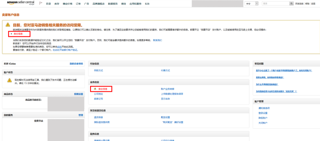 通过卖家平台中的"身份信息"页面,您可以在"设置 - 帐户信息 - 身份信息"选项卡下找到该页面