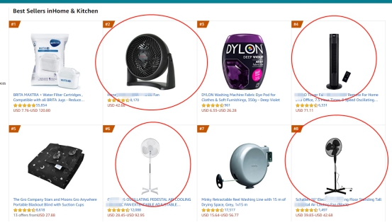 此外,我们还发现,在家居厨房类目里,已刮起一阵”妖风“,在亚马逊前50名的家居厨房类目里排名里,”电风扇“这类产品竟然占据了前10位。