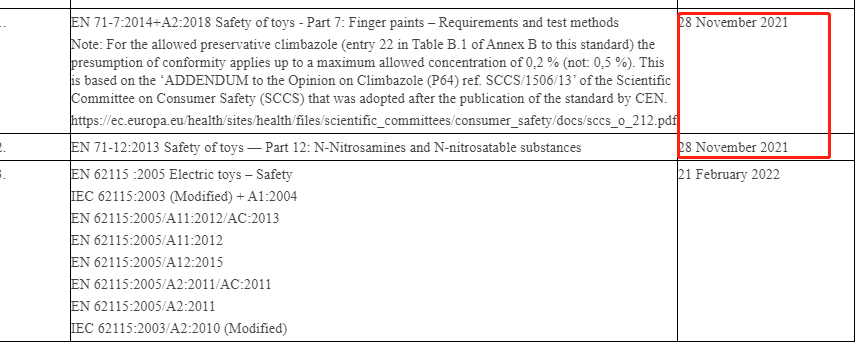 其中EN 71-12:2016与EN 71-7:2014+A2最慢要在今年11月28日调整。(如下图)