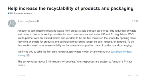从这则公告,表明为了保护环境的需要,亚马逊在公告里已表明可能准备推出“开辟更多回收渠道”。