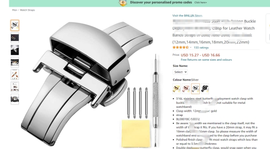 当然,在这个市场风口下,跟手表带相配搭的手表扣这样的配件也应运而生。无论是在亚马逊,还是在ebay ,只要你搜索Watch Strap Clasp(手表扣)这样的关健词,