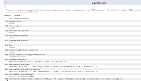 值得卖家朋友们注意的是,我们通过查询,此太阳能灯已于2019年4月份注册了类减压运动玩具“LuminAID”的文字商标。