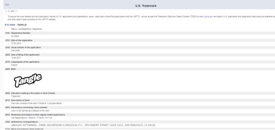 经我们核查发现,Tangle ,已于2018年8月份申请了28类的美国文字商标。