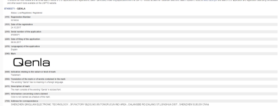 通过公开数据查询,我们发现,Qenla品牌已于2017年申请了美国商标。