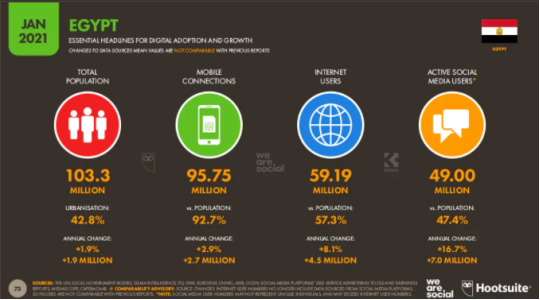 而且埃及的手机使用率特别的高。公开数据显示,埃及移动设备渗透率达95.75%,互联网渗透率为59.19%(如下图所示)。