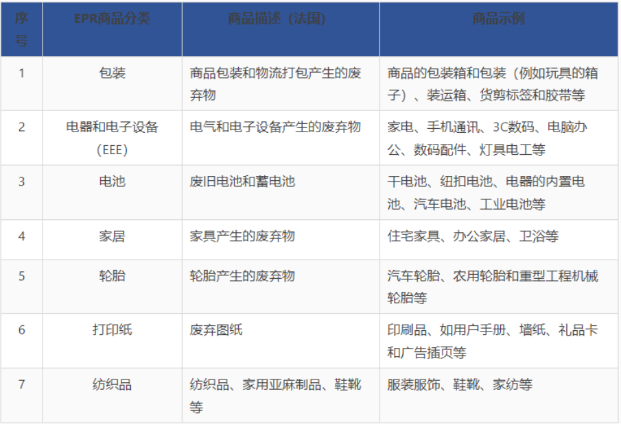 当卖家商品销售至法国,涉及以下7个类别的商品或有关废料,需要遵循EPR义务。法国政府机构正在考虑增加其他类别的商品。