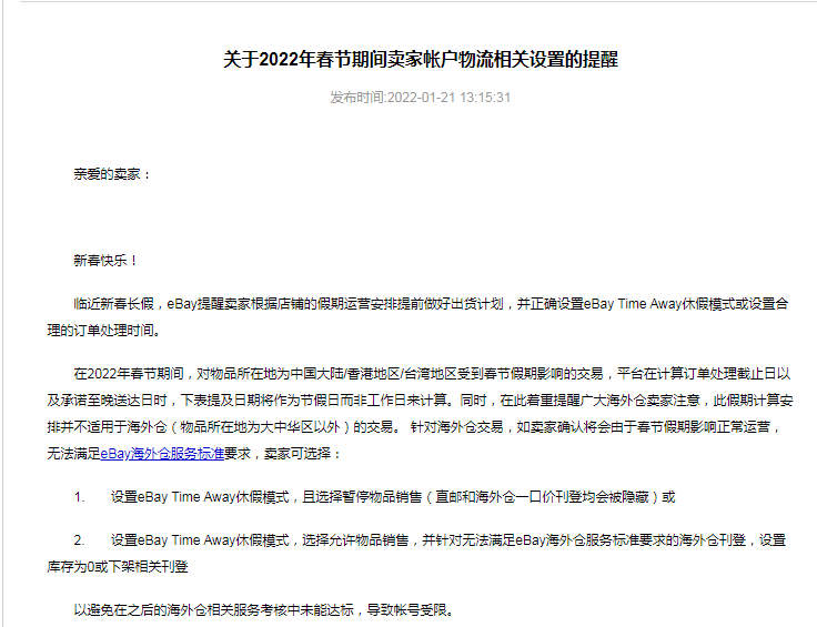 eBay提醒卖家,要注意春节期间物流相关的设置,提前做好出货计划,避免因为物流原因导致账号受限。如卖家确认将会由于春节假期影响正常运营,无法满足eBay海外仓服务标准要求,卖家可选择: