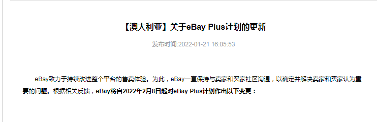 eBay通知称,根据相关反馈,eBay将自2022年2月8日起对eBay Plus计划作出以下变更: