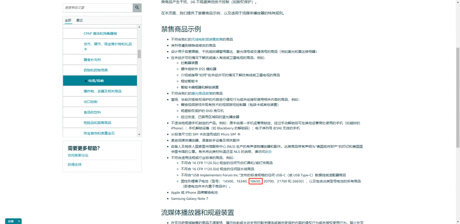 不仅仅是18650的圆柱形锂离子电池属于禁售品,卖家朋友只需要在后台,在“帮助”里面搜索“危险品和禁售商品”,就可以看到型号:(14500,16340, ,20700,21700 和26650),以及包含此类型号电池的所有商品(即使电池并未内置于商品中)都属于禁售商品。