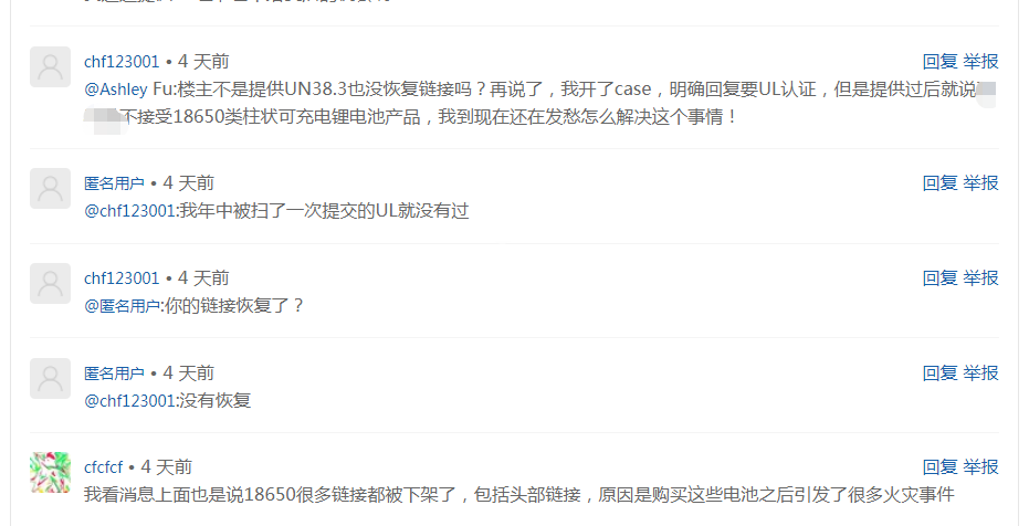 “我开了Case,明确回复UL认证,但是,提供过后,就说不接受18650类柱状可充电锂.”卖家发愁的回答。