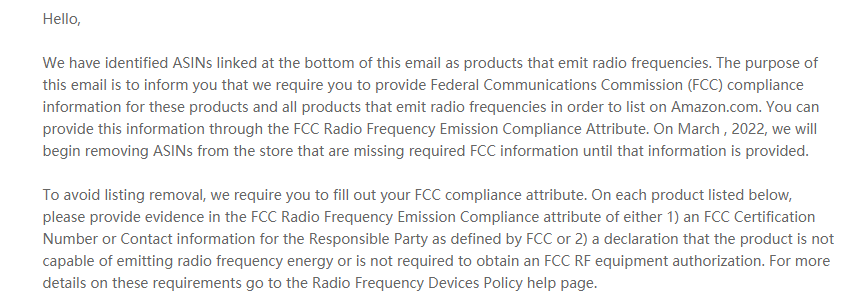 意思简单地说,对于符合要求的射频设备产品,建议卖家进行FCC合规。否则,平台将开始从商店中删除缺少必要FCC信息的ASINs,