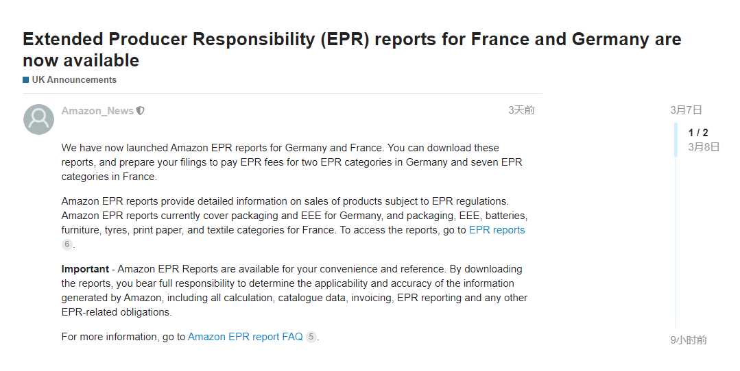 通知称,亚马逊已经为德国法国站卖家推出了亚马逊EPR报告,卖家可以下载报告并且准备进行备案,以支付德法两国EPR类别的费用。报告类型分为月、季,年。