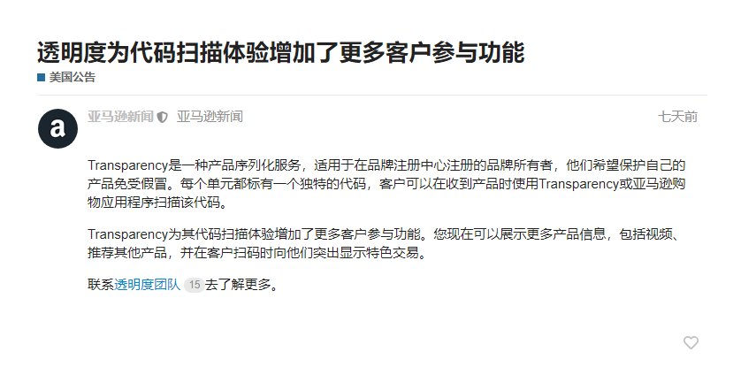 通告称,透明计划Transparency program为其代码扫描体验增加了更多客户参与功能,你现在可以展示更多产品信息,并在客户扫码时向他们突出显示特色交易。