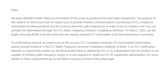 自3月7号起凡是符合FCC标准的商品,亚马逊已要求卖家根据美国认证要求,上传认证资料,否则根据美国政策限售不合规出售。