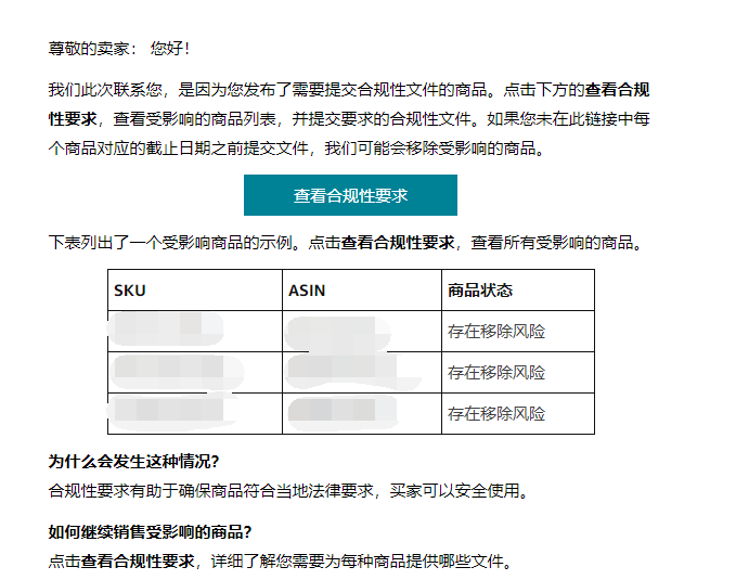 邮件称,因为卖家发布的产品需要提交合规性文件的商品,卖家可以查看受影响的商品列表,并提交要求的合规性文件,如果卖家未在截止日期之前提交文件,平台可能会移除受影响的商品。