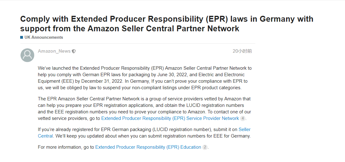 通知称,亚马逊推出了扩展生产者责任(EPR),以帮助卖家在2022年6月30日之前遵守德国的EPR包装法律,并在2022年12月31日之前遵守电气和电子设备(EEE)相关法律。