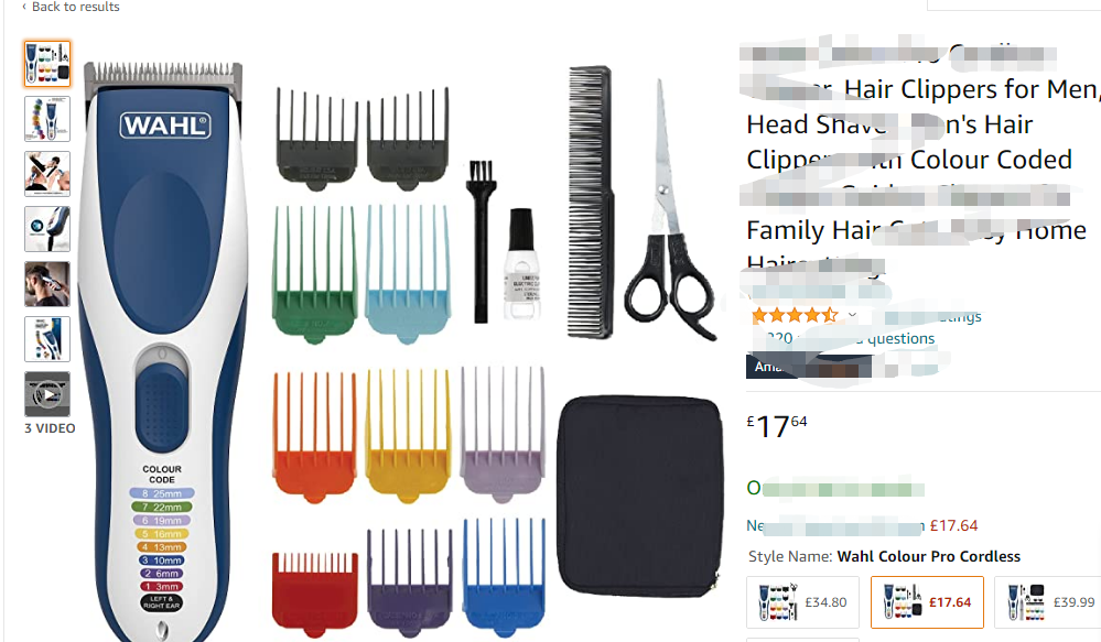 另外,从亚马逊店铺展现的商品信息来看,该商品套件配有八把附件梳子(3、6、10、13、16、19、22、25毫米)、左右耳锥、理发梳、剪刀和保养材料。